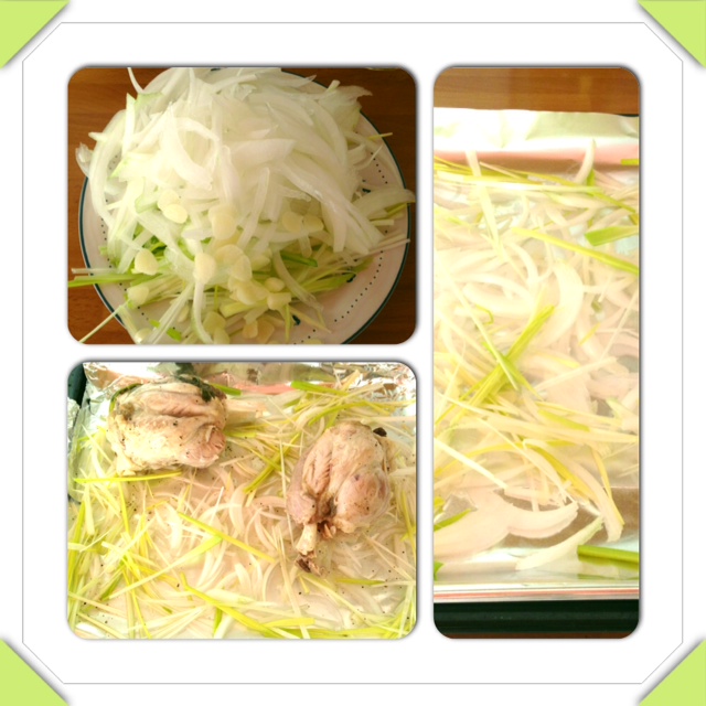 2.- cut finely the onion and leek. Cover the oven tray with foil and put over the cutted vegetables.