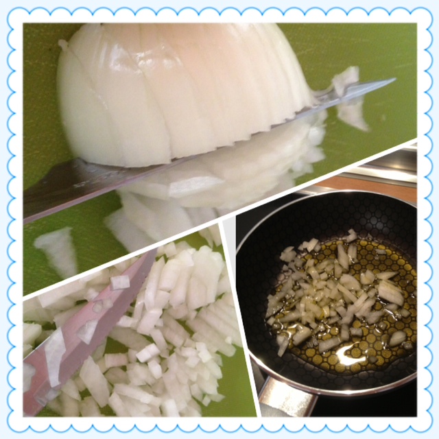 2.- Raya la cebolla, bastante menos en proporción, y ve friéndola en la sarten con aceite. En cuanto al aceite, es mejor no pasarse, se echa de normal a poco, recuerda que la patata mengüa, y si hay mucho aceite, habrá que retirarlo después.