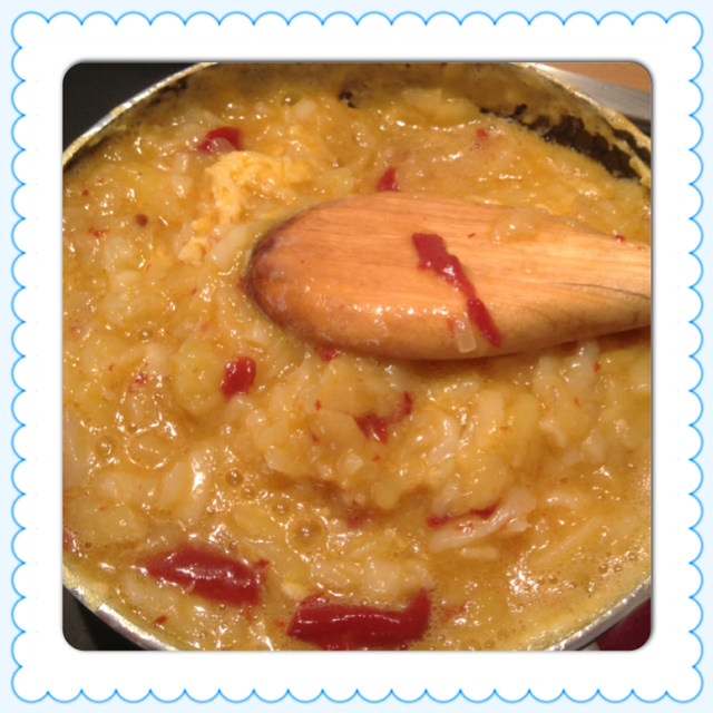 3.- cuando se vaya haciendo añade la patata, y baja el fuego para que no se te fría muy rápido la patata, queremos que quede echa pero de poco en poco. Remueve frecuente.