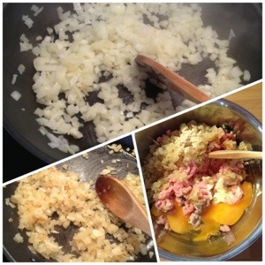 2.- Mezclar en un bol: carne, sal, pimienta y perejil, el refrito, un poco de pan rallado y los huevos.