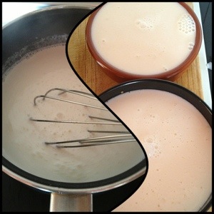 3.- pon a hervir 2 de los tres vasos de leche junto con el de nata. En el vaso de leche restante, disuelve muy bien los sobres de cuajo, que no queden grumos. Esto es muy importante.