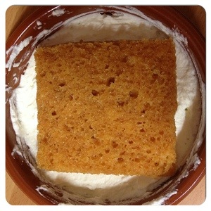 8.- pon en el fondo del recipiente nata, encima el bizcocho o sobao y cubre con la crema pastelera. Pon un film y mete en el frigo.