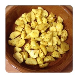 1 – Cut the potatoes into wedges and introduce it in the bag and one by one all the ingredients. The closed with a knot and stir well so that all potatoes are well impregnated .