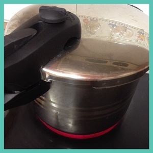 2.- pon la perola al fuego máximo. Cierrala y espera que suba la valvula. Cuando suba, baja el fuego justo a la mitad y déjalo unos 35 minutos