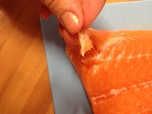 1.- mira si al salmon le quedan espinas gruesas que se quitan estirando con una pinza o manos, tocalo y ve quitando todo.