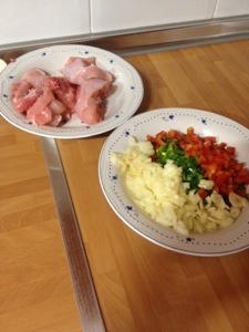 – picado y cortado en pequeñito: cebolla, pimiento verde y rojo, ajo