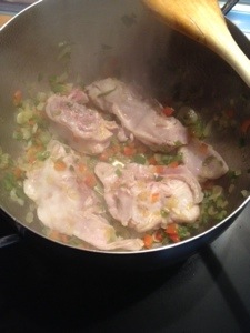 1.- haz un refrito con las verduras cortadas en trocitos, sal y el laurel, cuando este casi hecho bien pochado, añade el conejo y frie un rato moviéndolo para que no se pegue.