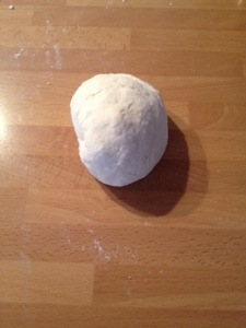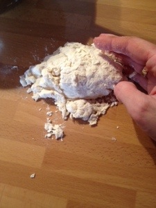 5.- en un bol pon la harina (la cantidad siempre dependerá de cuanto quieras). Añade un poquito de auga y remueve. Si queda harina por ligar, echa un poquito mas de agua. Tenemos que obtener una masa manejable que puedes acabar amasando en una superficie limpia. No se tiene que pegar, ya que la tenemos que amasar.