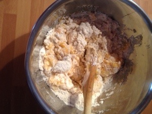 1.- hay que elaborar la pasta brisé, asi que mezcla todos los ingredientes en un bol, trabaja con ayuda de una cuchara y vuelca en una superficie limpia y comienza a amasar hasta que consigas una masa manejable y no pegajosa. También podeis forrar el molde con galleta triturada y mantequilla como siempre… Pero la pasta brise en mucho mas rica!