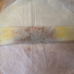 5.- Batimos la llema de huevo y preparamos un pincel. Despegar una lamina de pasta Brick con cuidado y abajo y en horizontal ponemos un poco de relleno, sin pasarse, y desde abajo hacia arriba, lo tapamos enrollando una capa de la masa y con una vuelta solo.