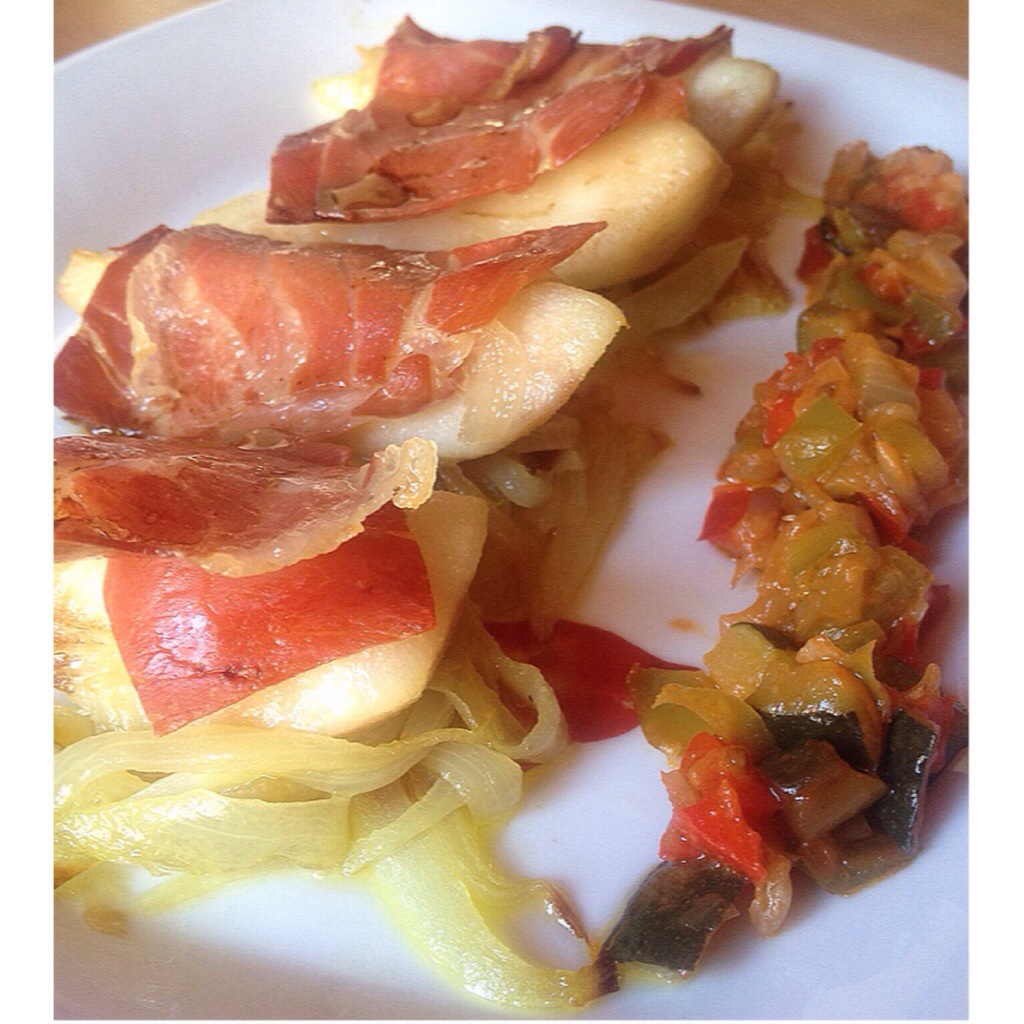 3.- Cuando este la pera ablandada, pon todo en una bandeja (yo ya lo monto en la bandeja que vaya a servirlas) haciendo montones: cebolla, pera y luego lonchas de jamón y mete al horno a 200º durante 8 minutos.