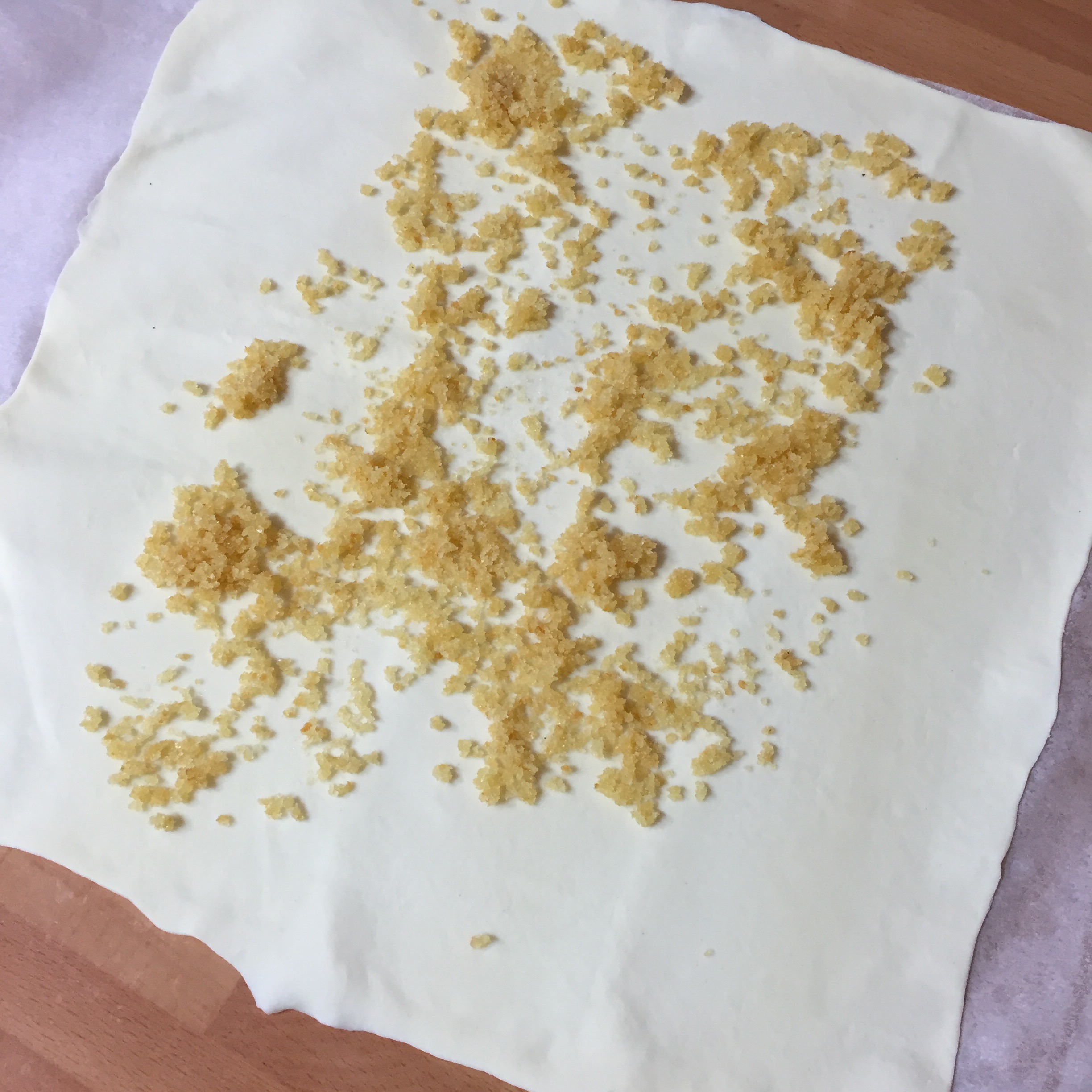 2.- extender la masa de hojaldre, y si es hojaldre, amasar estirando un poco. Agujerear la superficie con un palillo.