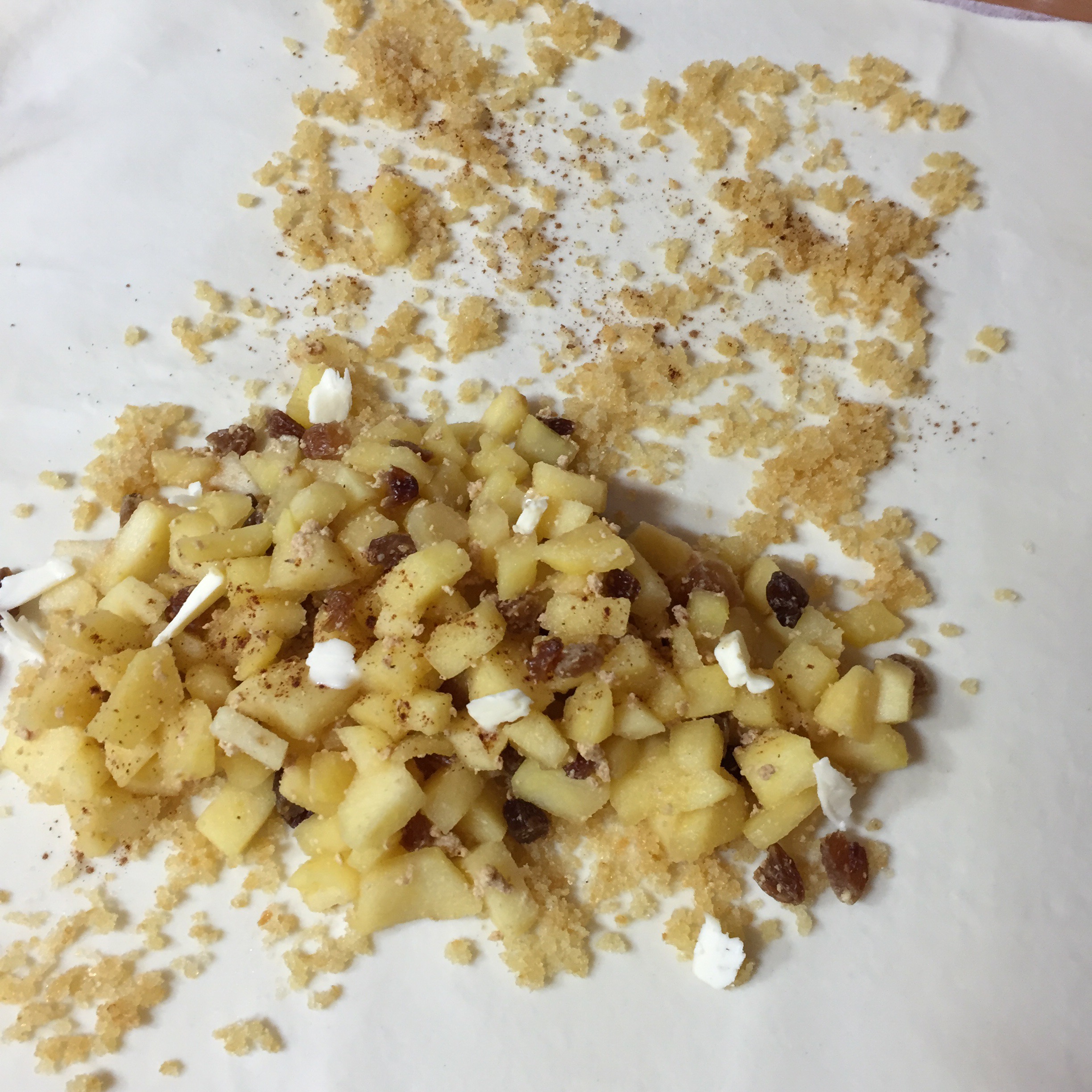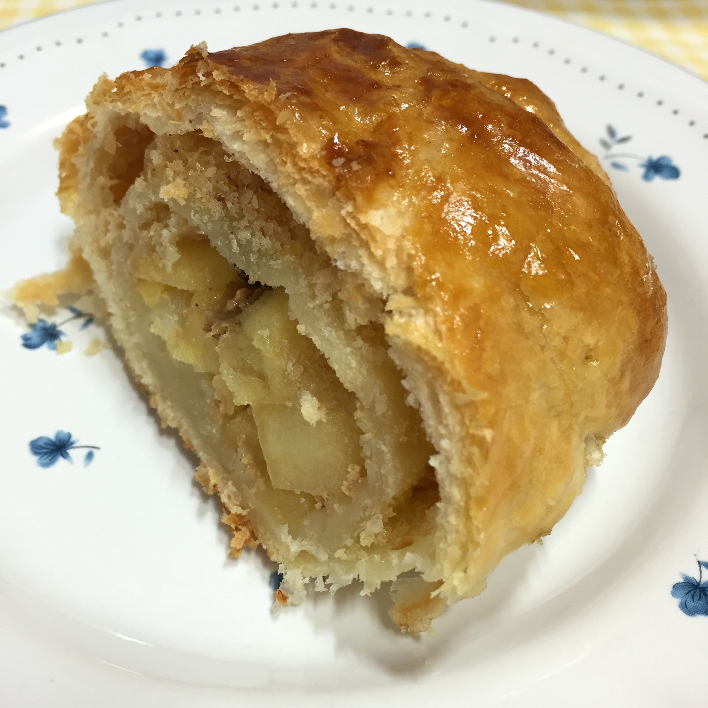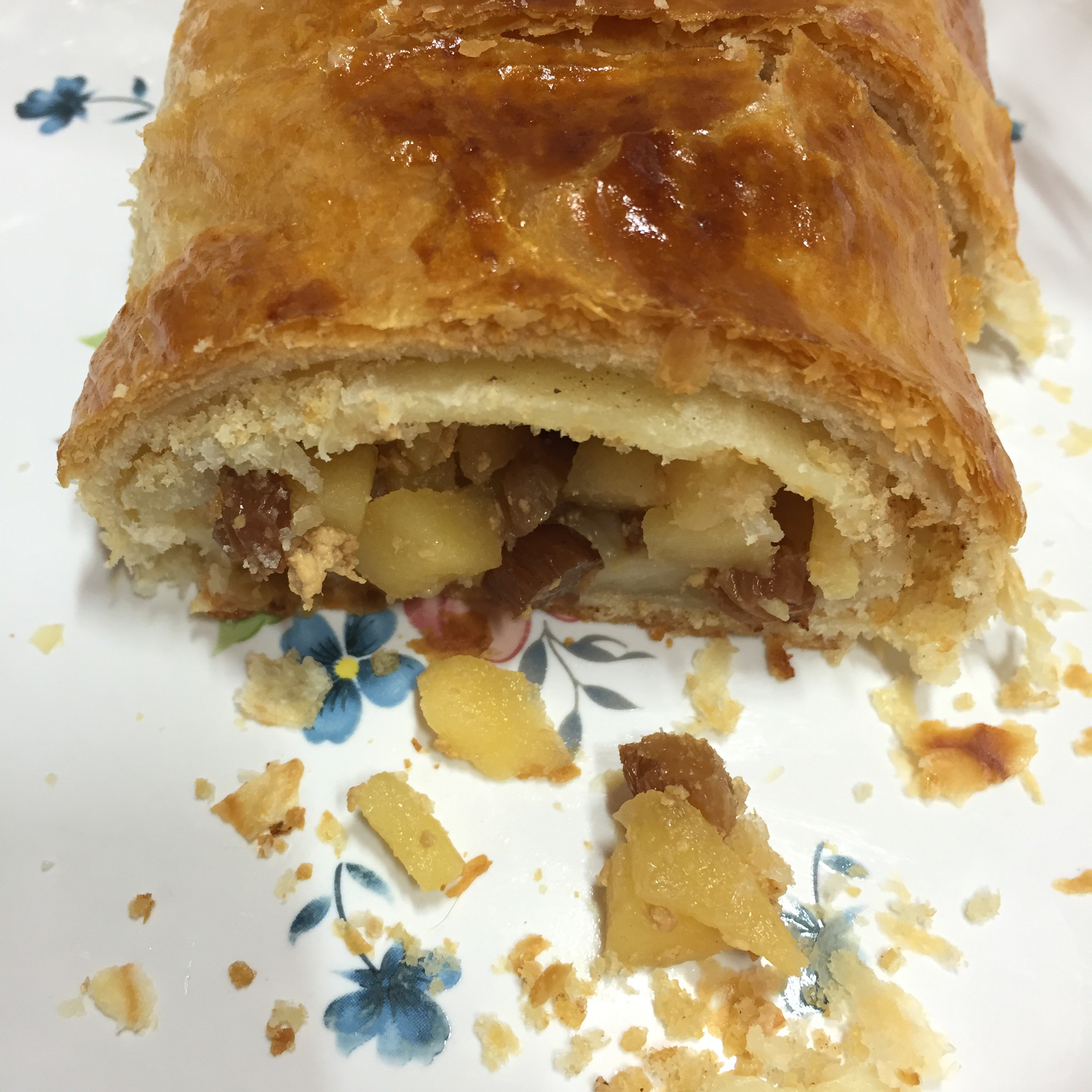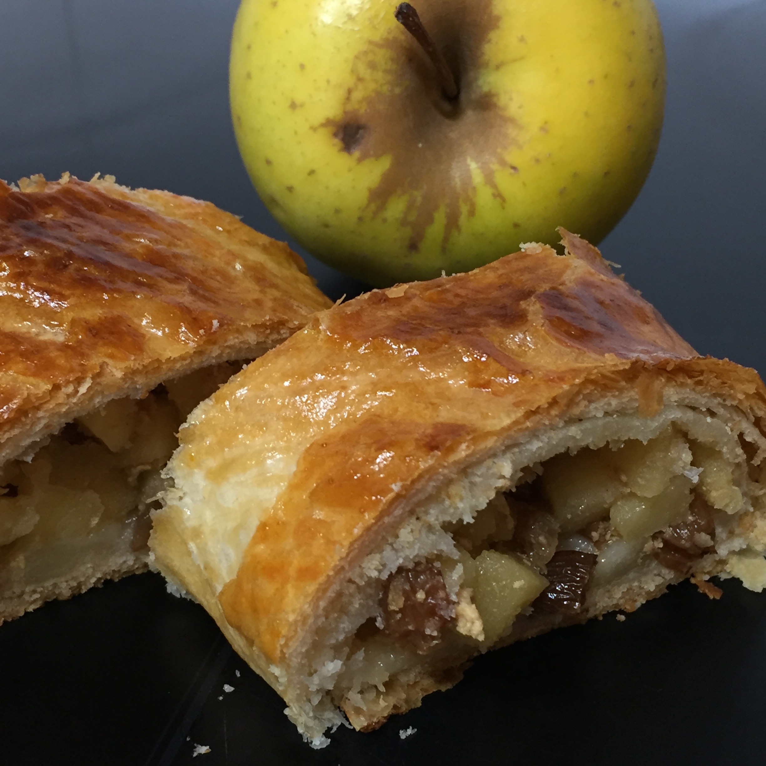 El resultado, suave,dulce y mucha manzana en trozitos muy pequeñitos, tambien se puede hacer con pasta Brise o Brick ademas de hojaldre.