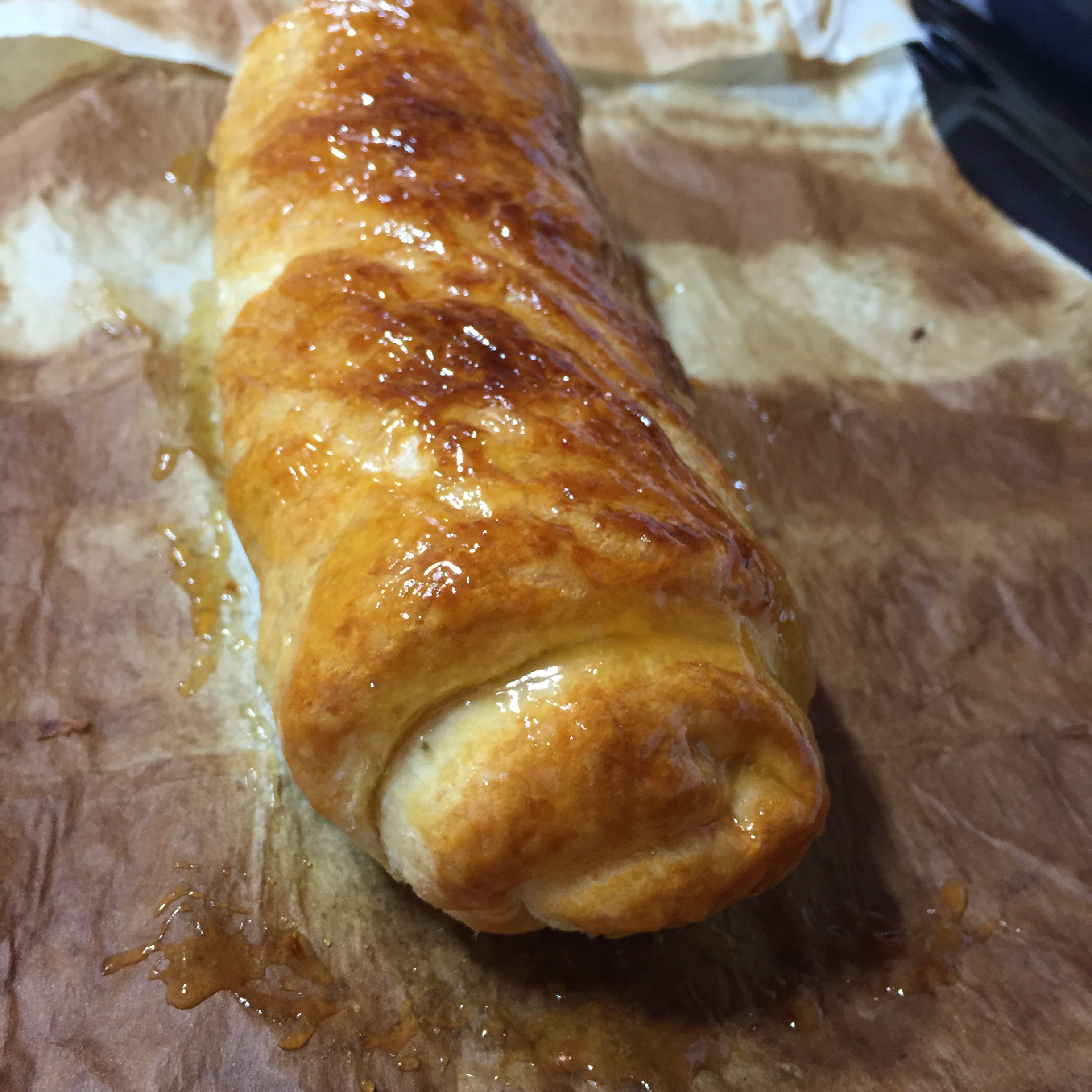 7.- pincelar con huevo batido e introducir al horno y hacer hasta que dore. No lo saques muy pronto pues el hojaldre tarda mas en hacerse.