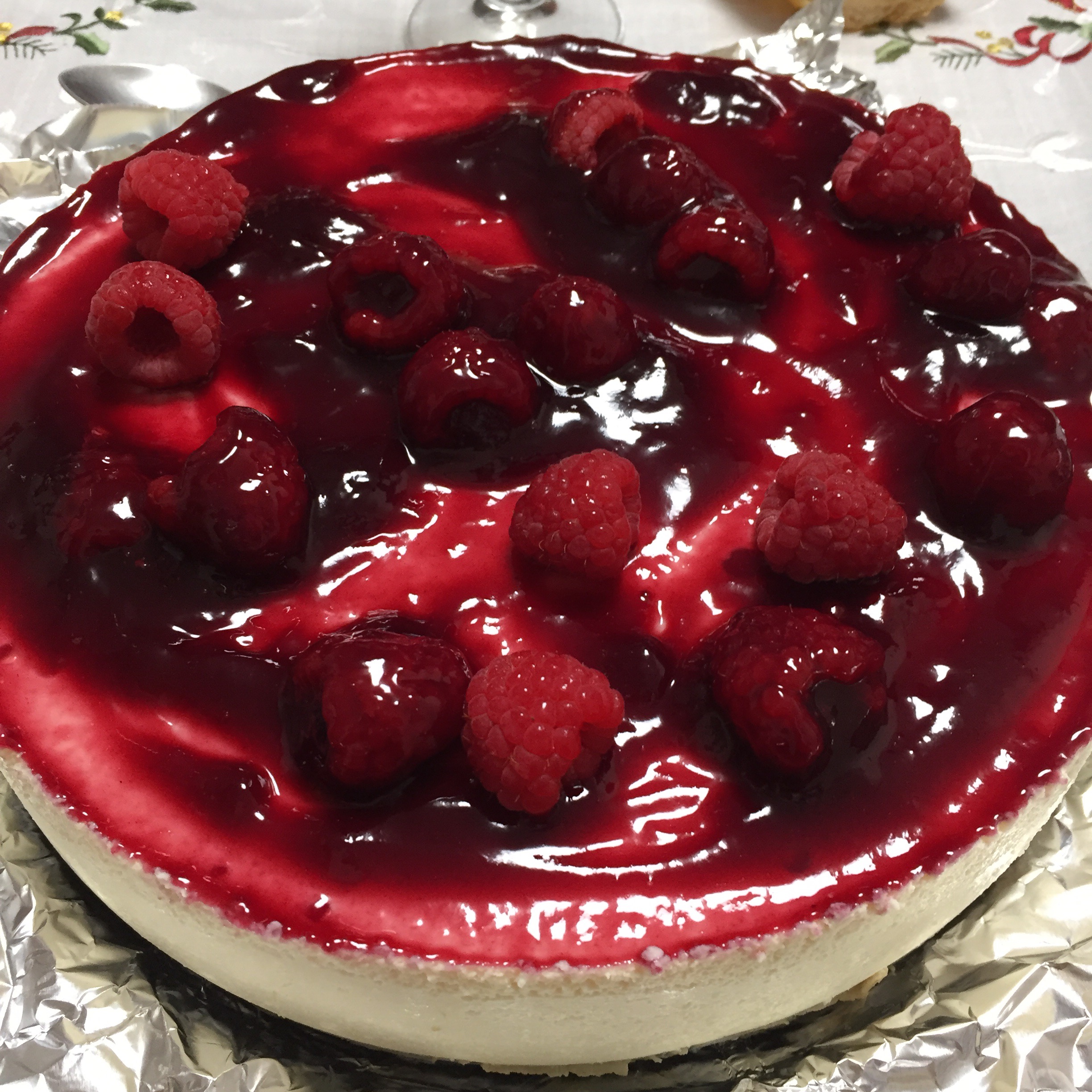9.- al servir poner al gusto la cobertura encima antes o después de desmoldar. Hay mil maneras de servir la mermelada. La puedes pincelar encima sola o con frutos, o la puedes calentar previamente en un cazo con un poquito de agua, hacerla liquida e incluso colarla en un chino para quitar las pepitas y después con un «biberón», dibujar unas líneas encima de la tarta y servir..