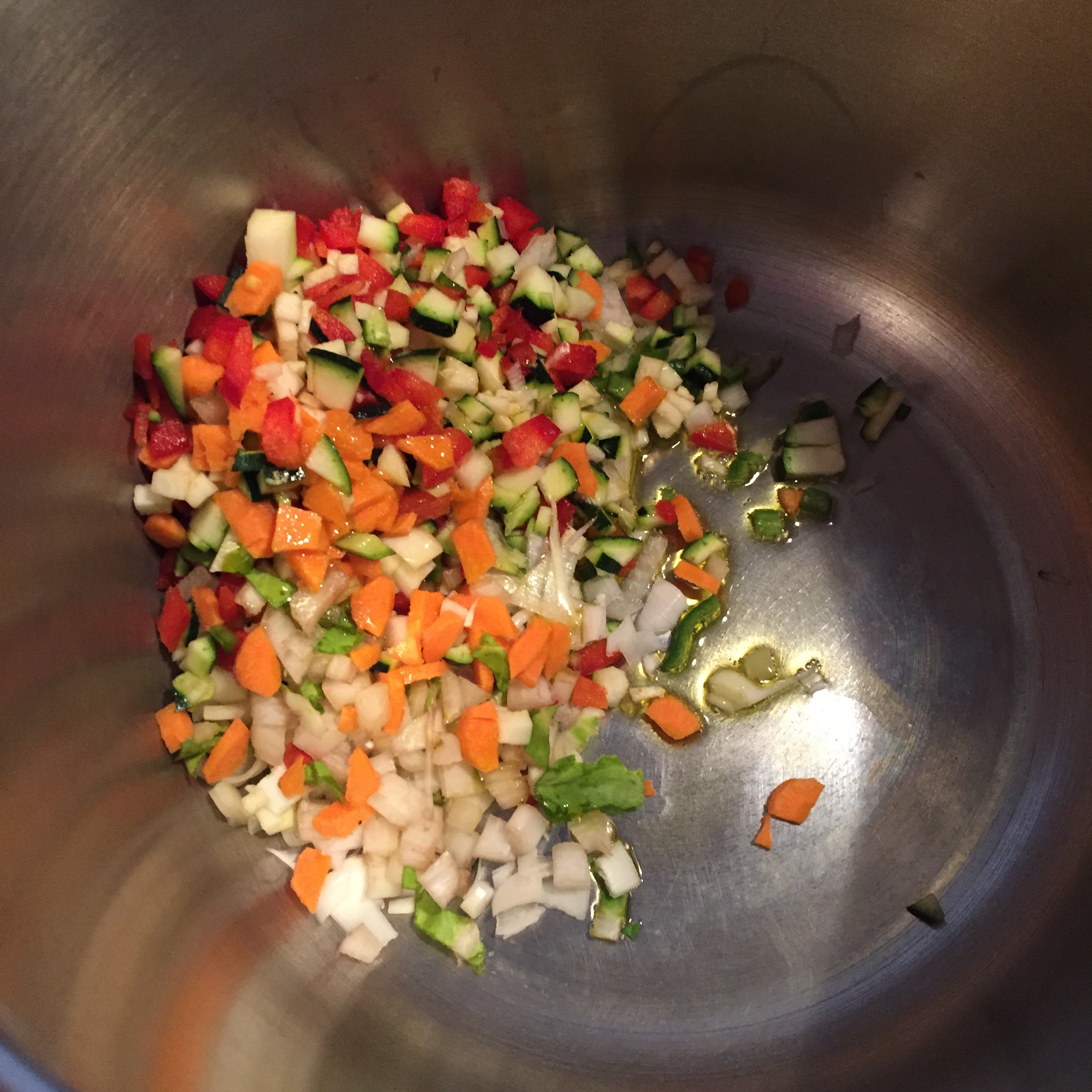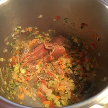 - en la olla rápida o exprés (se puede en una normal pero tardas mas) rehogar o freír las verduritas con un poco de sal, a los 5-7 minutos añadir las cabezas de las gambas y las gambas y remover. Dos minutos o tres.