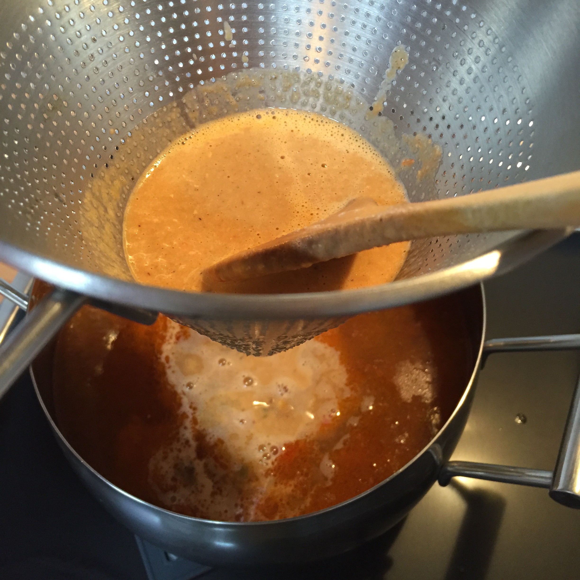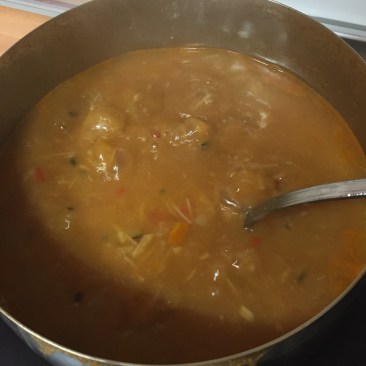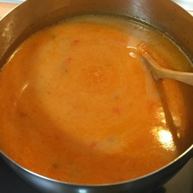 - en el vaso de la batidora añadir un poco de caldo y arroz con verduras. Batir y lo que salga pasarlo por el chino de metal sobre la sopa. Esto es para que coja cuerpo y mucho sabor gracias a las cabezas de gambas etc..